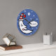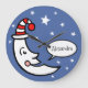 An illustration of the moon in his night cap surrounded by stars in a clear night sky.