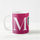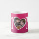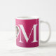 Add your photo to this Custom Mothers Day Photo Mug! Vibrant pink background with light heart shapes in the background. Big typographic "MOM" in all caps, where the centre letter is a heart shape.