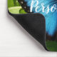 Custom mouse pad with tropical blue Morpho butterfly photo background. Classy brush script typography and exotic background image. Elegant mousepad gift. Monogrammed with your name initial letters or surname. Cute Holiday or Birthday gift idea for friends, family, mum, mother, grandma, wife, daughter, girl, sister etc. Custom computer accessories with beautiful close up macro nature photography.