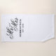 Custom Mr & Mrs beach towel for newly weds couple. Elegant wedding day gift idea for newlyweds and honeymooners. Personalised presents with surname of bride and groom plus date of marriage. Beautiful script typography design. Chic black and white template design for married couples. Create towels for new husband and wife. Create his and hers for him and her. Fun summer accessories for tropical beach destination or pool. White or custom colour.