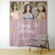 Happy Birthday! Custom Photo Booth or Party Wall Backdrop as birthday party wall decor! Space for 3 photos of the birthday girl, and easily customise the modern typography design with your name, message, and birth date. This layout features printed gold confetti sparkles over a blush pink background.