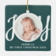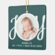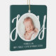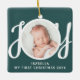 This cute Baby's First Christmas Photo Ornament is decorated with the word JOY in stylish script typography on a green background.