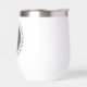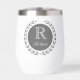 Custom name thermal wine tumbler is shown with a winner's gold wreath print with a sample initial and name.