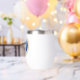 Custom name thermal wine tumbler is shown with a winner's gold wreath print with a sample initial and name.