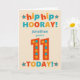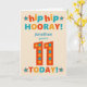 A bright and cheerful birthday card for you to personalize on the front cover, with colorful lettering on a cream background. The front cover greeting is, 'hip hip HOORAY! (Space for you to add the name), you're 11 years old TODAY!' in a bold, colorful script. The red number 11 is extra-large and has big dots in golden yellow and a greenish blue. The inside message is just a suggestion and you can easily change it or delete it if you prefer something different or no printed inside message at all.