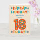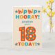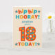 A bright and cheerful birthday card for you to personalize on the front cover, with colorful lettering on a cream background. The front cover greeting is, 'hip hip HOORAY! (Space for you to add the name), you're 18 years old TODAY!' in a bold, colorful script. The red number 18 is extra-large and has big dots in golden yellow and a greenish blue. The inside message is just a suggestion and you can easily change it or delete it if you prefer something different or no printed inside message at all.