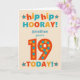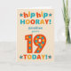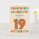 A bright and cheerful birthday card for you to personalize on the front cover, with colorful lettering on a cream background. The front cover greeting is, 'hip hip HOORAY! (Space for you to add the name), you're 19 years old TODAY!' in a bold, colorful script. The red number 19 is extra-large and has big dots in golden yellow and a greenish blue. The inside message is just a suggestion and you can easily change it or delete it if you prefer something different or no printed inside message at all.