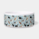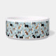 Cute Australian Shepherds / Aussie dog bowl in black, brown and merle coats sit and stand scattered dog bones and paw prints on a light blue background your own custom pet name.