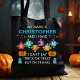 Custom Name Autism Halloween Candy Tote Bag. Adorable personalised Halloween candy bag for kids on the autism spectrum. Accented with rainbow Halloween stars, carved pumpkins and cute lil ghosts. Perfect for non verbal kiddos who have trouble saying trick or treat. Personalise this custom design with your child's name.