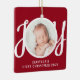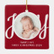 This cute Baby's First Christmas Photo Ornament is decorated with the word JOY in stylish script typography on a red background.