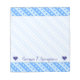 This fun notepad design features a pattern of hearts and stripes coloured various shades of blue. It also features a customisable name near the bottom, between heart shapes. [~Z0000006]