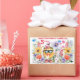 The most colorful, fun design with cute emoji character in a flower garden complete with kittens, bees, butterflies, bluebirds, and pink hearts.
