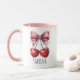 Add a sweet and stylish touch to your daily routine with this adorable personalized cherry and pink bow mug! Featuring a charming watercolor-style illustration of two ripe red cherries tied with a lovely pink ribbon, this design is both whimsical and chic. The mug's interior and handle boast a matching soft pink color, making it an extra pretty addition to your kitchenware.