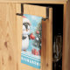 Create a unique custom Christmas kitchen towel that features a cute penguin decorating a Christmas tree designed on a snowy blue background with elegant snowflakes. Use the template to type your family name or a saying for the unique kitchen decor for the holiday season.