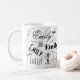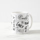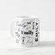 A custom name typography mug of the first name Emily in a variety of type styles that overlaps the initial in the background. Simple colours of contrasting black, white and grey. The name says it all. No one can take your coffee by accident.