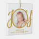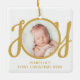 This cute Baby's First Christmas Photo Ornament is decorated with the word JOY in stylish gold script typography on a white background.