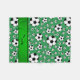 Modern and trendy Custom name sports random black and white soccer balls pattern green background and with green stripe personalised with just add your name gifts or monogram gifts or your initials for a unique gift. Sports gift ideas for men and boys and girls. Ideal for birthdays.