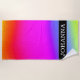 This beach towel design features a fun, rainbow-like multicolored gradient pattern featuring various shades of colours like yellow, orange, red, pink, purple, blue and green. It also features a personalised name in white coloured text within a dark coloured area on the front. [~Z0000000]