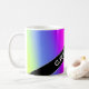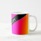 This mug design features a fun, rainbow-like multicolored gradient pattern featuring various shades of colours like yellow, orange, red, pink, purple, blue and green. It also features a personalised name in white coloured text within a dark coloured area, with both at an angle. [~Z0000051]