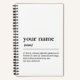 Modern black and white Notebook featuring a personalised definition of any custom name or word in minimalist dictionary style typography. Write your own meaning of a dear friend or your favourite word using the text boxes when you click "Personalise". You can also enter the Design tool and change the white background colour to any colour you like. Makes the perfect personalised gift for your best friend, family member or partner in crime.