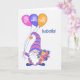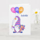 A cute Get Well Soon greeting card for you to personalize, with a traditional Scandinavian gnome, or tomte, carrying three balloons with the words, GET, WELL, SOON on them and a colorful bunch of flowers, in colors to match the gnomes clothes and the balloons, blue, pink and orange. The name of the recipient that you can change on the front cover is in matching blue. The gnome has a very tall, striped hat with a fluffy bobble on the end of it, to match the bobbles on its dark blue shoes. He has a big white beard, almost down to his feet and polka dot clothes. The white background is lightly textured and the inside message is just a suggestion that you can easily change or delete if you wish.