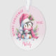 Create a personalised girly pink ornament with a cute penguin in a pink Santa hat and scarf sitting with a snowman and surrounded with ornaments and holiday greenery. The template text makes it easy to customise with your name and year. The name is in a script calligraphy font, adding elegance to this keepsake for girls who love penguins and pink colours.