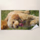 This cute golden doodle dog beach towel features a photo of a puppy at the park. Add your own custom name to make this design your own! Photography created by award-winning photographer Maria Jeffs.