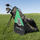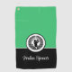 This golf towel is shown as is in a two-tone colour of black and green with a white accent stripe and shows an art print of a golfer.