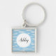 This keychain is shown in a blue and white paint brush strokes print design with a sample name.