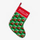 Custom name kid's red choo choo train cute soft coral fleece quality Small Christmas Stocking. Cute x-mas decorations for the winter Holiday season. Red locomotive toy design for children. Make your own personalised Holiday sock for son, grandson, nephew, new baby, newborn etc. Great for 1st Christmas. Red and green colours with adorable pattern.