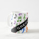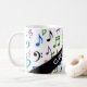 This mug design features a pattern involving various music notes and music notation symbols coloured a variety of colours. It also features a custom name in white coloured text within a dark coloured area, with both at an angle. [~Z0000051]