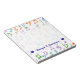 This notepad design features a pattern involving various music notes and music notation symbols coloured a variety of colours. It also features a personalised name near the bottom, between two heart shapes. [~Z0000101]
