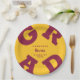 GRAD in bold maroon lettering curves around the edges of these gold graduation party paper plates - available in 2 sizes. Congratulations above the name of your graduate and the Class of below. **TIP: Click on CUSTOMIZE button; click on COLOR box on top right; enter your colour hex code in the #xxxxxx box to match your school colours. SEE ENTIRE COLLECTION of pre-done colour combinations and more in our store.