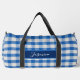 This unique duffel bag design is whimsical and stylish. The background consists of an abstract a classic blue background. The front features your custom name or short text in stylish white script on a matching blue band. All colours in this design can be customised and you may further personalise the bag with your choice of font type in the design tool area.