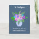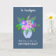 This pretty, contemporary floral Mother's Day greeting card to personalize on the front, features a bouquet of pink, blue and white flowers in a pale blue vase on a dark blue background. There is a space at the top for you to write the name in white handwriting script. Below the vase of flowers, it says, 'With lots of love on ' and then 'MOTHER'S DAY!' in a decorative lettering. The inside message is just a suggestion and you can easily change it or delete it altogether if you prefer a 'blank inside' card.