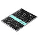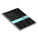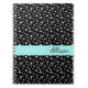Notebook shown with a cute black and white polka dots print and a aqua colour accent strip with a custom name sample.