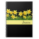 Notebook shown with a black background colour with a lovely yellow daffodil flowers graphic print and a name sample.