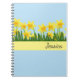 Notebook shown with a blue background colour with a lovely yellow daffodil flowers graphic print and a name sample.