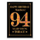 A chic 94th birthday card for you to customise with the name of relationship of the recipient. The numbers, 94, are filled with a yellow, orange and red tartan pattern and outlined in gold-effect. The front cover message is, 'HAPPY BIRTHDAY, followed by a space for your customisation, 94 years young today', in gold-effect lettering on a black background. There are gold-effect stars each side of 'TODAY!' and at the corners of the slim gold-effect border. Please feel free to personalise the inside message or delete it if you wish.