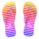These stylish sandals showcase a design of pink flamingos and colourful stripes.