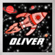 Cartoon graphic rocket space poster. Great to brighten a space themed kids room. Personalise this item with your child's name (up to 6 letters). (***Please note some names will not always fit due to the nature of the font, please contact me and I will be happy to post a poster with your name on). This example reads: Oliver. Uniquely designed by Sarah Trett.