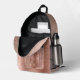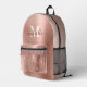 This elegant personalised backpack features a brushed rose gold metallic foil printed background, with rose gold dusty blush pink glitter and textured foil dripping from the front pocket. The text boxes allow for a monogram white initial along with a calligraphy script font in marsala bronze.
