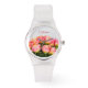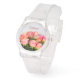 I only have one complaint. I ordered the watch with clear case and strap, and what was sent was white case and strap. I'm going to keep it because 1) it looks very nice in white, and 2) it would take too long to get a replacement made and sent in time for my occasion. Aside from the mix up with the color, the watch does look very good in white. The purple dial is actually sparkly which did not show in the online images. That was a nice surprise. If you like Swatch watches this is very similar to those. It's 33.6mm in diameter, 10.5mm thick, and 40.6mm lug to lug. Stainless steel case back says 3ATM/30m WR, so no swimming or showering or submerging this one. If you like Woodstock, this is a great choice.