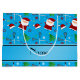 Modern and trendy sports lacrosse pattern with lacrosse sticks, snow, cute santa claus, santa hats, white red snowflakes, green red and yellow stars, green christmas trees with sky blue background and with sky blue black stripe personalised with just add your name gifts or monogram gifts or your initials for a unique gift. Sports gift ideas for men and boys and girls. Ideal for christmas presents.