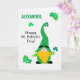 A fun greeting card for you to personalise for someone special on St. Patrick's Day, with a cute leprechaun, holding a shamrock. The leprechaun has a very tall hat, in a green pattern, a big ginger beard, a huge nose, striped sleeves and socks and black shoes. At the top, in dark green lettering, you can add the name of the recipient and the inside message is easy to customize or delete.