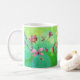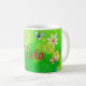 Customisable name on summer vibes green Coffee Mug. Happy summer mug with Watercolor wildflowers and butterflies on a vibrant green background with dansing bokeh rings like a summer meadow..