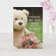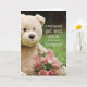Customise the name and surprise a special woman or man. They will love this sweet Get Well card with a light brown teddy bear holding flowers. A lovely design and religious words after the surgery.