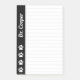 Personalised lined post it notes for a veterinarian. Classy minimalist design in black and white with paw print decoration and discrete grey lines. Customise it by replacing the sample name Dr. Cooper with your own name or any other custom name you want to print on the notes. Great custom post it notes for a veterinary doctor to use in his practice.
