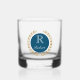 Custom name rocks glass is shown with a winner's gold wreath print with a sample initial and name.