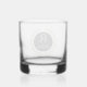Custom name rocks glass is shown with a winner's gold wreath print with a sample initial and name.